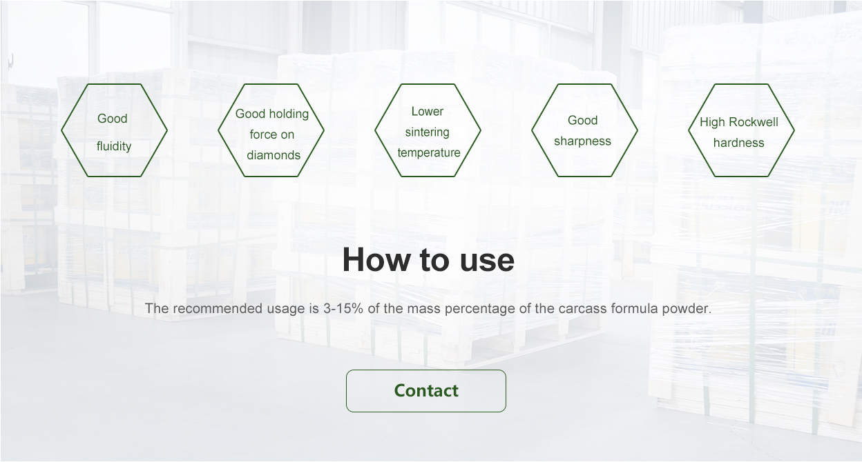 As an additive in the diamond tools, it is mostly used in medium and low-grade diamond tools. Users can adjust the usage according to the requirement of tools performance.