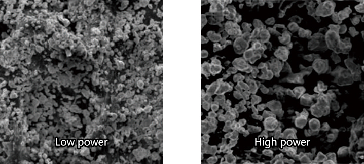 The distribution of the product under high and low magnification microscopes, it shows the morphology of the powder.