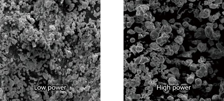 The distribution of the product under high and low magnification microscopes, it shows the morphology of the powder.
