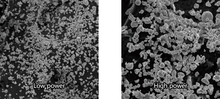 The distribution of the product under high and low magnification microscopes, it shows the morphology of the powder.