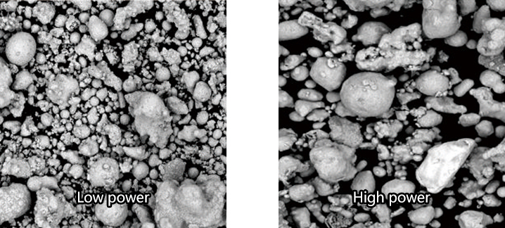 The distribution of the product under high and low magnification microscopes, it shows the morphology of the powder.