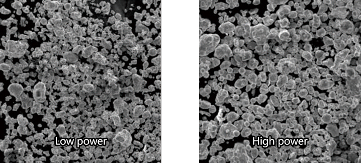 The distribution of the product under high and low magnification microscopes, it shows the morphology of the powder.