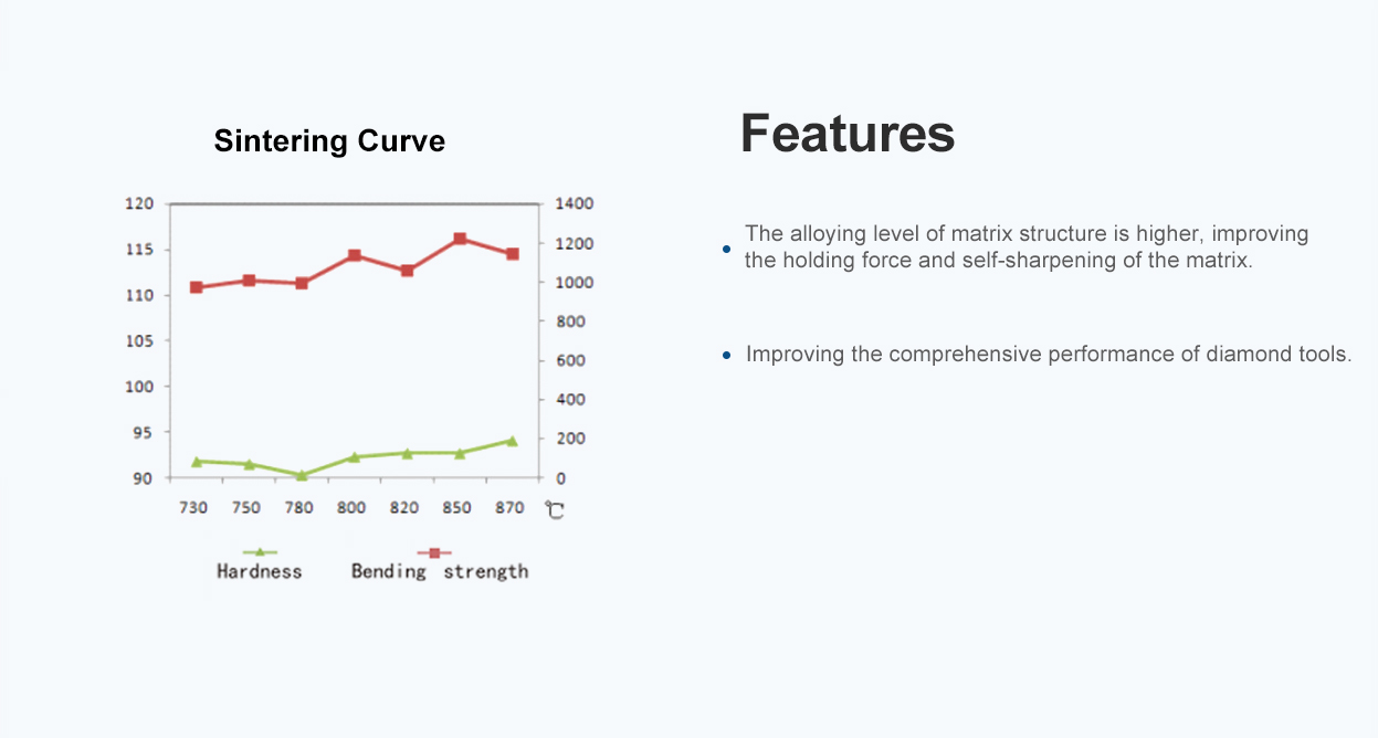 Widely used in various diamond tools. Suitable for low hardness and high grades diamond tools. Such as wall grooving blades , small saw blades for soft rock and grinding tools.