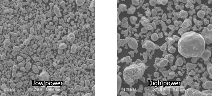 The distribution of the product under high and low magnification microscopes, it shows the morphology of the powder.