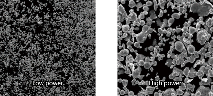 The distribution of the product under high and low magnification microscopes, it shows the morphology of the powder.